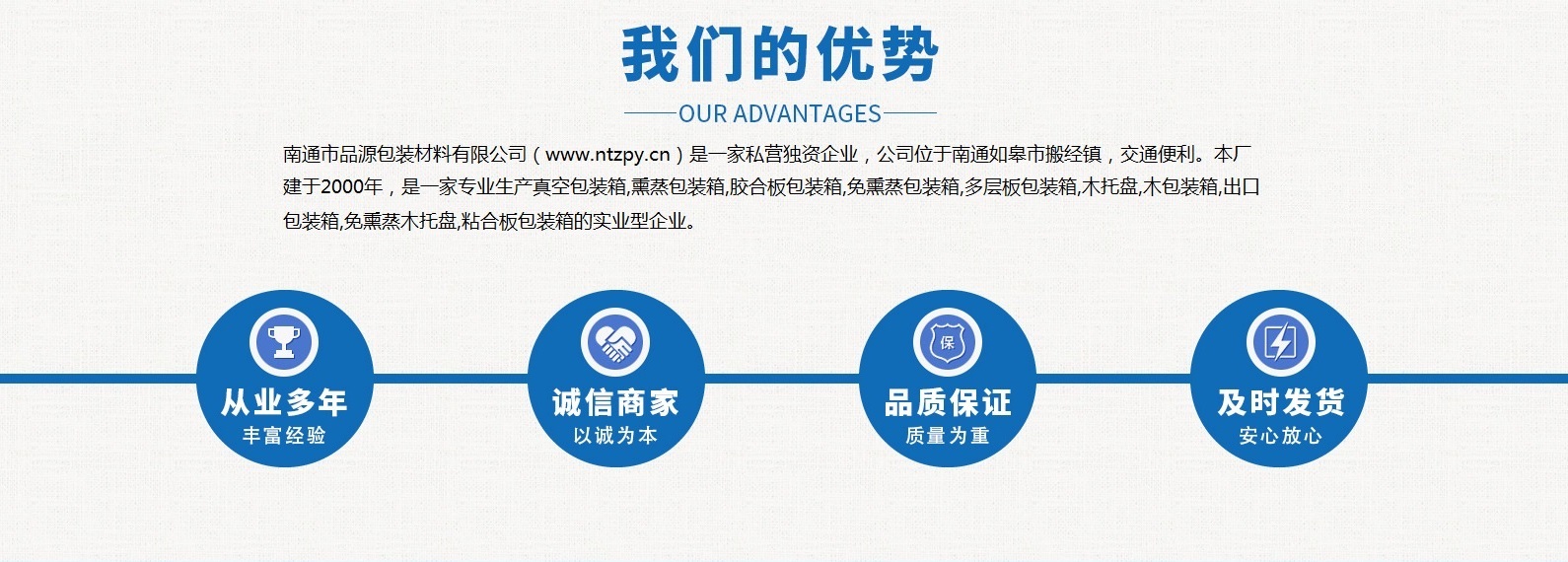 南通市品源包裝材料有限公司(www.buuty.com)是一家私營(yíng)獨(dú)資企業(yè),公司位于南通如皋市搬經(jīng)鎮(zhèn),交通便利。本廠(chǎng)建于2000年,是一家專(zhuān)業(yè)生產(chǎn)真空包裝箱,熏蒸包裝箱,膠合板包裝箱,免熏蒸包裝箱,多層板包裝箱,木托盤(pán),木包裝箱,出口包裝箱,免熏蒸木托盤(pán),粘合板包裝箱的實(shí)業(yè)型企業(yè)。